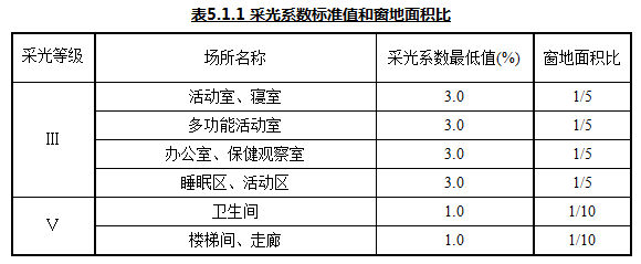 5.1.1 托儿所、幼儿园的生活用房、服务管理用房和供应用房中的厨房等均应有直接天然采光,其采光系数标准值和窗地面积比应符合表5.1.1的规定。
