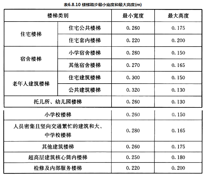 6.8.10 楼梯踏步的宽度和高度应符合表6.8.10的规定。