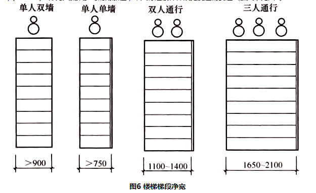 楼梯梯段净宽在防火标准中是以每股人流为0.55m计,并规定按两股人流最小宽度不应小于1.10m,这对疏散楼梯是适用的,而对住宅套内楼梯、维修专用楼梯外的其他平时用作日常主要交通的楼梯不完全适用,尤其是人员密集的公共建筑(如商场、剧场、体育馆等)主要楼梯应考虑多股人流通行,使垂直交通不造成拥挤和阻塞现象。此外,人流宽度按0.55m计算是最小值,实际上人体在行进中有一定摆幅和相互间空隙,因此本条规定每股人流宽度为0.55m+(0~0.15)m,(0~0.15)m即为人流众多时的附加值,单人行走楼梯梯段宽度还需要适当加大,见图6。