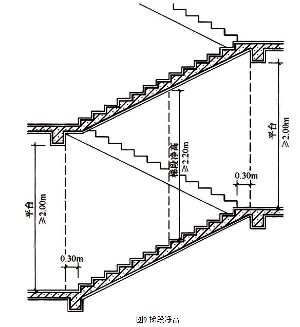 由于建筑竖向处理和楼梯做法变化,楼梯平台上部及下部净高不一定与各层净高一致,此时其净高不应小于2.00m。使人行进时不碰头。梯段净高一般应满足人在楼梯上伸直手臂向上旋升时手指刚触及上方突出物下缘一点为限,为保证人在行进时不碰头和产生压抑感,故按常用楼梯坡度,梯段净高不应小于2.20m,见图9。住宅等户内空间的非公共楼梯及检修专用楼梯,当条件不允许时可适当放宽要求。