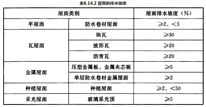 6.14.2 屋面排水坡度应根据屋顶结构形式、屋面基层类别、防水构造形式、材料性能及当地气候等条件确定,且应符合表6.14.2的规定,并应符合下列规定: