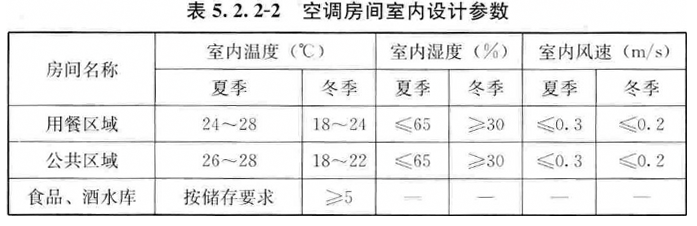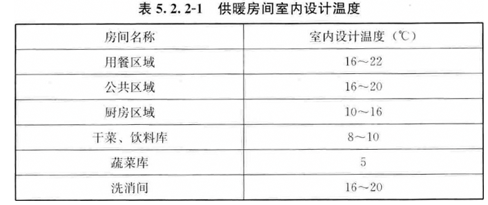 5.2.1 饮食建筑应根据规模、使用要求、所在气候区等选择设置供暖、通风或空气调节系统;并应根据当地的气象、水文、地质条件及能源情况等,选择经济合理的系统形式及冷、热源方式。5.2.2 室内设计参数应符合下列规定: 1 供暖房间室内设计温度应符合表5.2.2-1的规定;