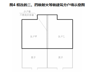 4.0.2 为了防止建筑火灾在不同的户之间相互蔓延,规定了三、四级耐火等级建筑之间的相邻外墙,相连建筑的分户墙的设置要求,如图4所示。