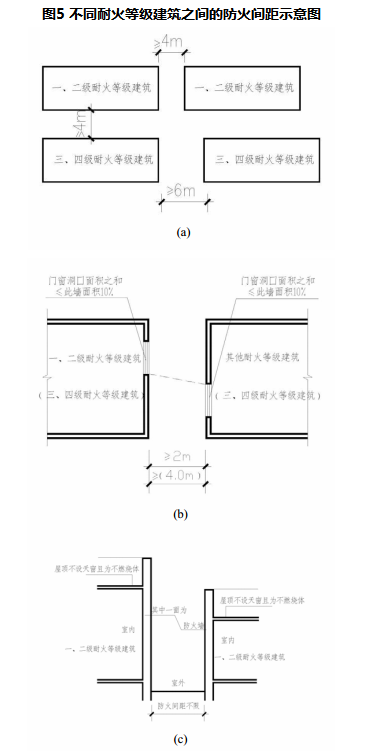 4.0.5 三、四级耐火等级建筑之间的防火间距不宜小于6m。当建筑相邻外墙为不燃烧体,墙上的门窗洞口面积之和小于等于该外墙面积的10%且不正对开设时,建筑之间的防火间距可为4m。