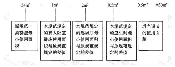 3 原规范规定的由卧室、起居室(厅)、厨房和卫生间等组成的住宅套型,虽然组成空间数不变,但因为综合考虑我国中小套型住房建设的国策,以及住宅部品技术产业化、集成化和家电设备技术更新等因素,各种住宅部品及家电尺寸有所减小,对各功能空间尺度的要求也相应减小。所以将原规范规定不应小于34㎡下调为不应小于30㎡。其具体测算方法是:
