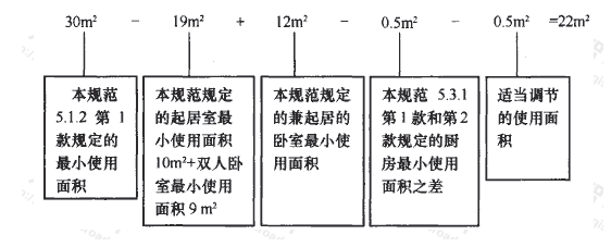 4 明确了基本功能空间不等于房间,没有要求独立封闭,有时不同的功能空间会部分地重合或相互“借用”。当起居功能空间和卧室功能空间合用时,称为兼起居的卧室等概念以后,提出了采用兼起居的卧室的最小套型,不应小于22㎡。其具体测算方法是: