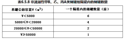 2 非沸溢性甲B、乙、丙A类储罐组隔堤内的储罐数量,不应超过表6.5.8的规定。