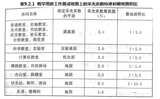9.2.1 教学用房工作面或地面上的采光系数不得低于表9.2.1的规定和现行国家标准《建筑采光设计标准》GB/T 50033的有关规定。在建筑方案设计时,其采光窗洞口面积应按不低于表9.2.1窗地面积比的规定估算。
