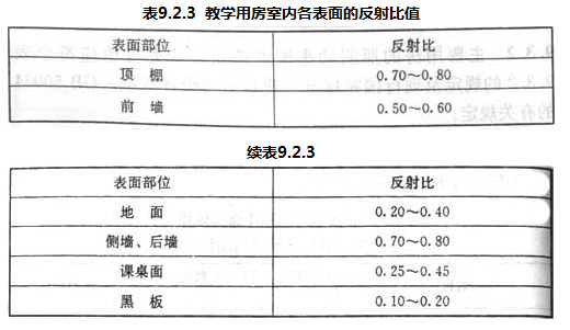 9.2.3 除舞蹈教室、体育建筑没施外,其他教学用房室内各表面的反射比值应符合表9.2.3的规定,会议室、卫生室(保健室)的室内各表面的反射比值宜符合表9.2.3的规定。