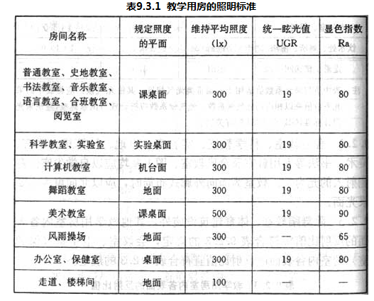 9 主要依据现行国家标准《建筑照明设计标准》GB50034,确定学校建筑用房的统一眩光值UGR和显色指数Ra。