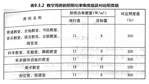 9.3.2 主要用房的照明功率密度值及对应照度值应符合表9.3.2的规定及现行国家标准《建筑照明设计标准》GB 50034的有关规定。