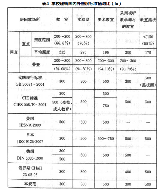 9.3.1 学校教学用房的照明标准是根据对我国各地99所学校的教学用房进行调查的结果,并参考CIE标准《国际照明委员会标准》及一些发达国家的标准,经综合分析研究后制定。学校教学用房的国内外照度标准值对比见表4。