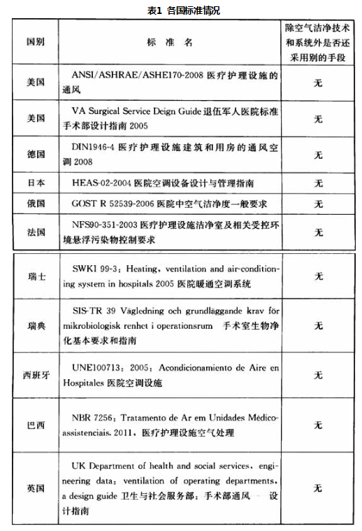 由于净化技术综合措施既除尘又除菌,可在全手术过程中有效控制医疗环境,除菌效率常在99.999%以上,且不会产生副作用和有害物质,简单易行。所以,目前为止所有国家的医院和手术室的标准在室内空气环境方面只提到了这种空气洁净技术和系统,见表1。