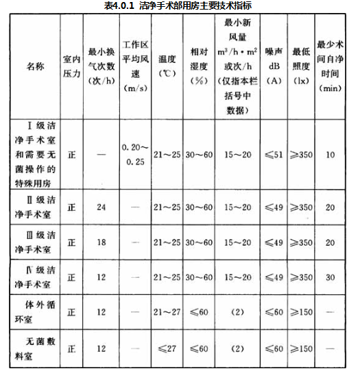 4.0.1、4.0.2 关于手术部洁净用房技术指标分别说明如下: