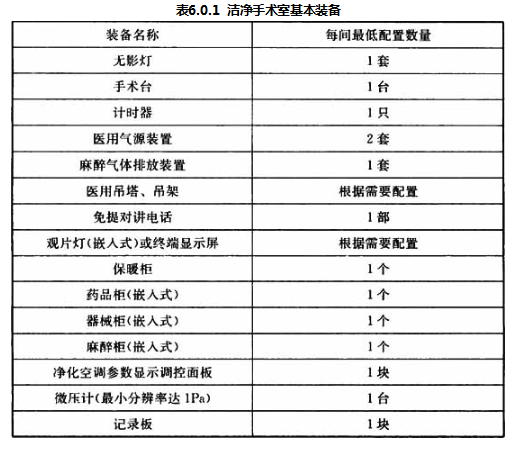 6.0.1 洁净手术室基本装备是指需在手术室内部进行建筑装配、安装的设施,不包括可移动的或临时用的医疗设备、电脑及与其配套的设备,此外,洁净辅助用房内的装备设施也不在此基本装备之列。