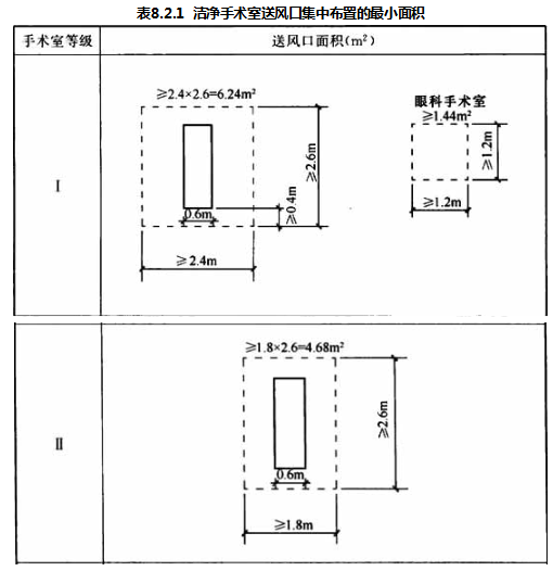 8.2.1 Ⅰ级~Ⅲ级洁净手术室内集中布置于手术台上方的非诱导型送风装置,应使包括手术台的一定区域即手术区处于洁净气流形成的主流区内。送风装置送风面积不应低于表8.2.1列出的数值。当眼科手术室超过30㎡,其他手术室净面积超过50㎡,且需要增大上述送风面积时,出风面积增大的比例不应超过手术室净面积增大的比例。