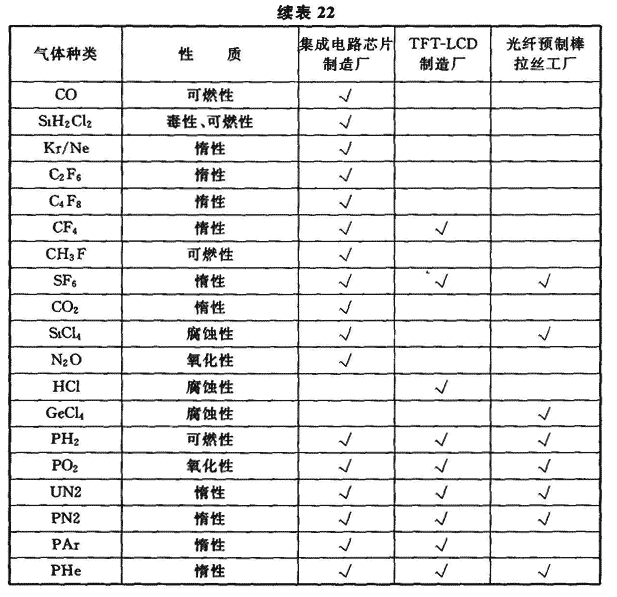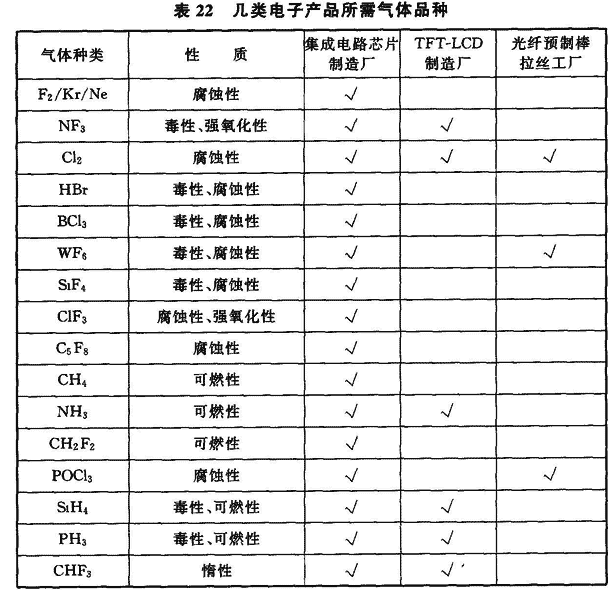 10.1.1 洁净厂房使用的气体有常用气体、干燥压缩空气及特种气体三大类,根据各种电子产品品种及其生产工艺的不同,使用气体的品种、纯度及杂质含量是不相同的。表22是几类电子产品所需气体品种。