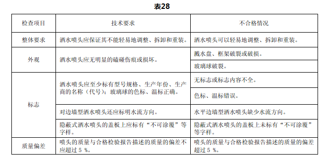 检查洒水喷头是否标有型号规格、生产年份、生产商的名称(代号);玻璃球的色标、温标是否正确;边墙型洒水喷头是否标示水流方向,隐蔽式洒水喷头的盖板上是否标有“不可涂覆”等字样。