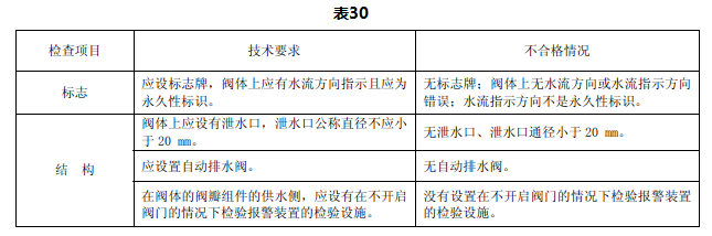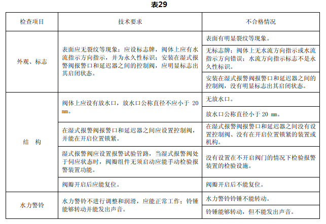 检查湿式报警阀、延迟器、水力警铃表面有无砂眼裂纹等现象;有无标志牌,阀体上是否有水流指示方向指示,指示方向是否错误,是否为永久性标识;安装在湿式报警阀报警口和延迟器之间的控制阀,是否明显标志出其启闭状态。