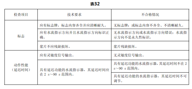 对于有延迟功能的水流指示器,将万用表连接水流指示器的输出接线,将水流指示器浆片沿着箭头指示方向推到底,同时启动秒表,观察万用表是否有通、断信号变化;万用表动作后同时停止秒表,观察记录动作时间是否在2s~90s范围内。
