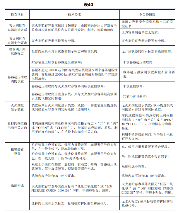 检查贮存装置上是否设有容器超压泄放阀;容器超压泄放阀的数量设置是否满足标准要求;检查容器超压泄放阀与灭火剂贮存容器间是否设置检修阀;容器超压泄放阀是否垂直安装,并与灭火剂贮存容器最高液面以上的气相空间相通。