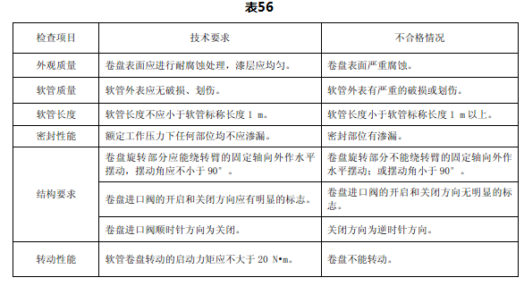6.8.5.2.1 目测检查消防软管卷盘外观质量、软管质量和结构要求,用钢卷尺测软管长度,用直角尺测卷盘摆动角。