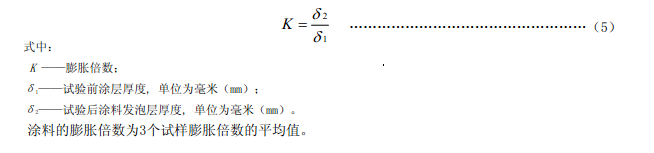 在已施工涂料的构件上,随机选取三个不同的涂层部位,用磁性测厚仪测量其厚度δ1。然后点燃2L汽油喷灯分别对准选定的三个位置,喷灯外焰应充分接触涂层,供火时间不低于5min。停止供火后用游标卡尺测量其发泡层厚度δ2。膨胀倍数按公式(4)求得,结果以三个测试值的平均值表示: