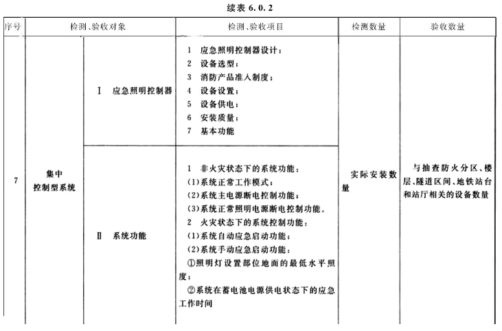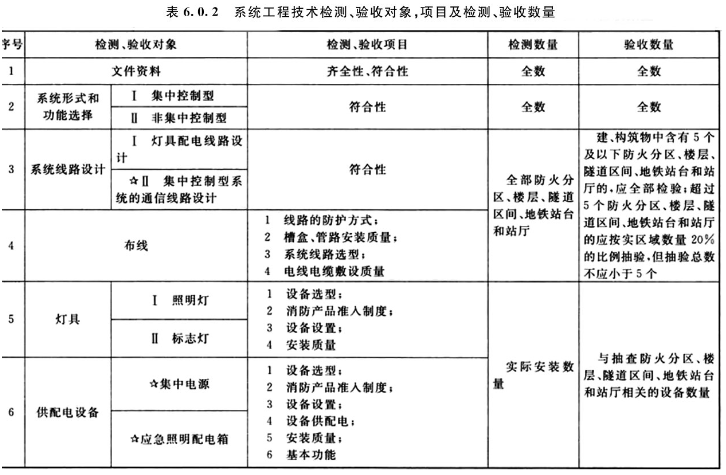 6.0.3 系统检测、验收时,应对施工单位提供的下列资料进行齐全性和符合性检查,并按附录E的规定填写记录: 1 竣工验收申请报告、设计变更通知书、竣工图; 2 工程质量事故处理报告; 3 施工现场质量管理检查记录; 4 系统安装过程质量检查记录; 5 系统部件的现场设置情况记录; 6 系统控制逻辑编程记录; 7 系统调试记录; 8 系统部件的检验报告、合格证明材料。6.0.4 根据各项目对系统工程质量影响严重程度的不同,将检测、验收的项目划分为A、B、C三个类别: 1 A类项目应符合下列规定: 1)系统中的应急照明控制器、集中电源、应急照明配电箱和灯具的选型与设计文件的符合性; 2)系统中的应急照明控制器、集中电源、应急照明配电箱和灯具消防产品准入制度的符合性; 3)应急照明控制器的应急启动、标志灯指示状态改变控制功能; 4)集中电源、应急照明配电箱的应急启动功能; 5)集中电源、应急照明配电箱的连锁控制功能; 6)灯具应急状态的保持功能; 7)集中电源、应急照明配电箱的电源分配输出功能。 2 B类项目应符合下列规定: 1) 本标准第6.0.3条规定资料的齐全性、符合性; 2) 系统在蓄电池电源供电状态下的持续应急工作时间。 3 其余项目应为C类项目;6.0.5 系统检测、验收结果判定准则应符合下列规定: 1 A类项目不合格数量应为0,B类项目不合格数量应小于或等于2,B类项目不合格数量加上C类项目不合格数量应小于或等于检查项目数量的5%的,系统检测、验收结果应为合格; 2 不符合合格判定准则的,系统检测、验收结果应为不合格。6.0.6 本节各项检测、验收项目中,当有不合格时,应修复或更换,并进行复验。复验时,对有抽验比例要求的,应加倍检验。