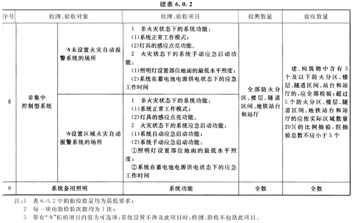 6.0.1 系统验收是对系统设计符合性的全面核查、是对施工质量的全面检查、是对系统部件功能及系统功能的全面检验,只有通过系统验收才能有效确保系统的选型和设置满足本标准和设计文件的要求,才能确保系统在火灾等紧急情况下能够可靠应急启动发挥应有的消防功能、保障人员的安全疏散。因此,将本条文确定为强制性条文,必须严格执行。6.0.2 本条规定了系统检测、验收的对象、项目和数量要求,系统的检测、验收应按附录E规定的检查要求和检查方法进行,并按照附录E的规定填写记录。6.0.3 本条规定了系统检测、验收时应具备的资料要求,资料的齐全性和符合性检查应按附录E规定的检查要求和检查方法进行,并按照附录E的规定填写记录。6.0.4 本条根据各项目对系统工程质量影响严重程度的不同,将检测、验收的项目划分为A、B、C三个类别。 1 按照设计文件的规定选择相应规格、型号、技术性能的产品,是保障系统运行稳定性和可靠性的基本要求;系统产品符合消防准入制度的要求是《中华人民共和国消防法》的明确规定;应急照明控制器的应急启动功能、标志灯指示状态改变控制功能,集中电源或应急照明配电箱的分配电输出功能,集中电源或应急照明配电箱的连锁控制功能,灯具应急状态的保持功能是在火灾等紧急状态下确保系统灯具可靠发挥应急照明和疏散指示功能的基本要求;集中电源或应急照明配电箱的分配电输出功能是保障系统正常运行的基本要求,上述项目不符合相关要求将严重影响系统运行的稳定性和可靠性,因此,将上述项目定为A类项目; 2 核查本标准6.0.3条规定资料的齐全性和符合性是检验系统施工、调试环节质量管理情况的一种主要方式,而且系统部件的现场设置记录、系统控制逻辑编程记录等技术资料是系统日常管理维护必不可少的参考资料,这些技术资料的不齐全、不符合将在很大程度上影响系统维护管理工作的有效开展;系统灯具的蓄电池电源是确保灯具保持应急工作状态的后备保障性电源,如果系统灯具的蓄电池电源容量不满足要求,存在人员尚未完全安全疏散时灯具的光源因供电中断而熄灭的隐患,在很大程度上影响系统功能的发挥,因此,将上述项目定为B类项目。6.0.5 本条规定了系统检测、验收结果的判定准则。该判定准则是判定系统部件的选型和设置、施工质量、系统部件功能和系统功能是否符合设计文件及本标准相关要求的判定标准,是判定系统是否具有持续维持稳定、可靠运行能力的判定标准,是判定系统检测、验收结果合格与否的直接依据。因此,将本条文确定为强制性条文,必须严格执行。6.0.6 系统检测、验收过程中,对功能不符合要求的系统部件应予以更换、对不符合要求的项目应进行整改,系统部件更换或项目整改后,应对相关项目重新进行检测、验收,直至所有检测、验收的项目均符合本标准的相关要求。对有抽检比例要求的项目,为了全面检验该类项目的施工质量、系统部件和系统的功能,首次检测、验收不合格需进行再次检测、验收时,该类项目的抽检比例应加倍。