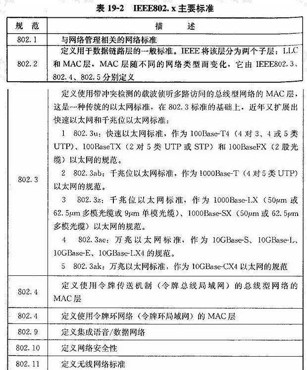2)IEEE 802.x主要标准参见表19-2。