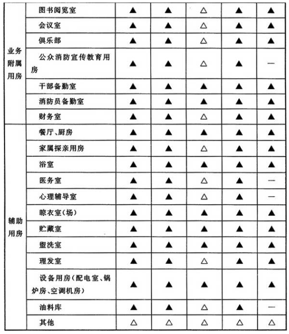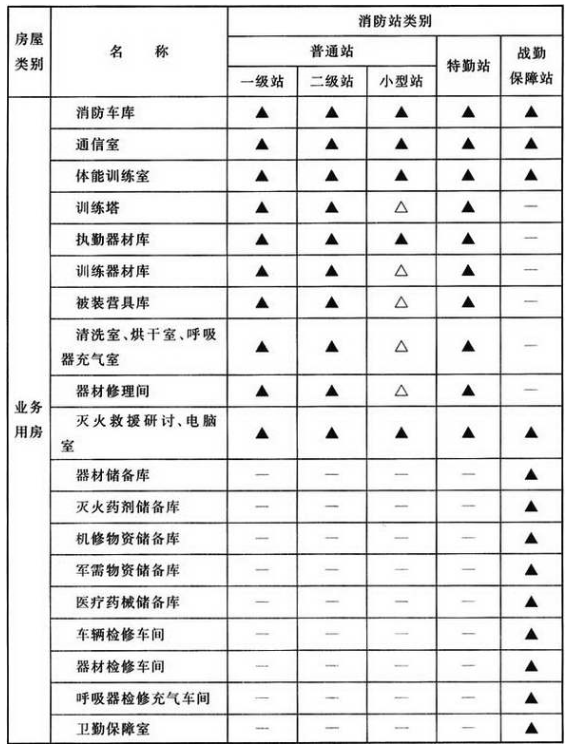 消防站的房屋建筑包括业务用房、业务附属用房和辅助用房,各类用房的分类与建设要求见表2。