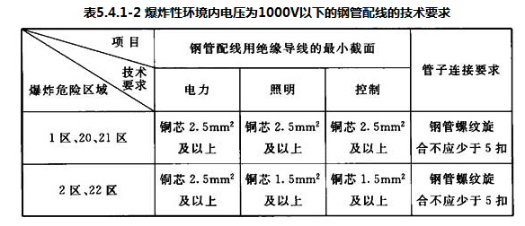 除本质安全系统的电路外,在爆炸性环境内电压为1000V以下的钢管配线的技术要求应符合表5.4.1-2的规定。