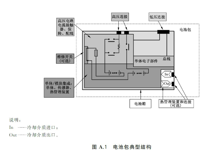 电池包是能量存储装置,通常包括电池单体、部件、高压电路、过流保护装置及与其他外部系统的接口(如冷却、高压、辅助低压和通信等)。图A.1是一个电池包的典型结构。
