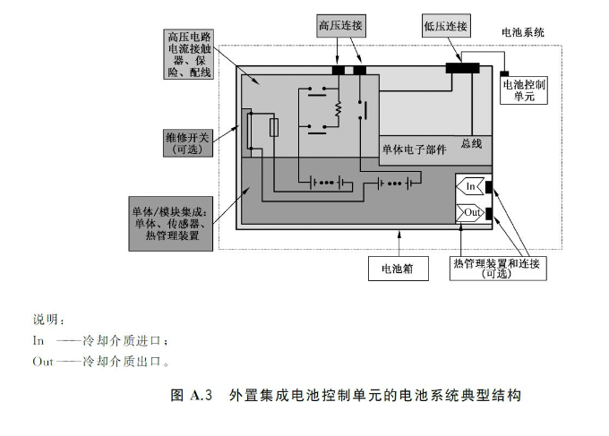 A.2 电池系统 电池系统是能量存储装置,包括电池单体或电池包、电路和电控单元(如电池控制单元、电流接触器)。电池系统的典型结构有两种,分别是集成了电池控制单元的电池系统和带外置电池控制单元的电池系统,分别如图A.2和图A.3所示。