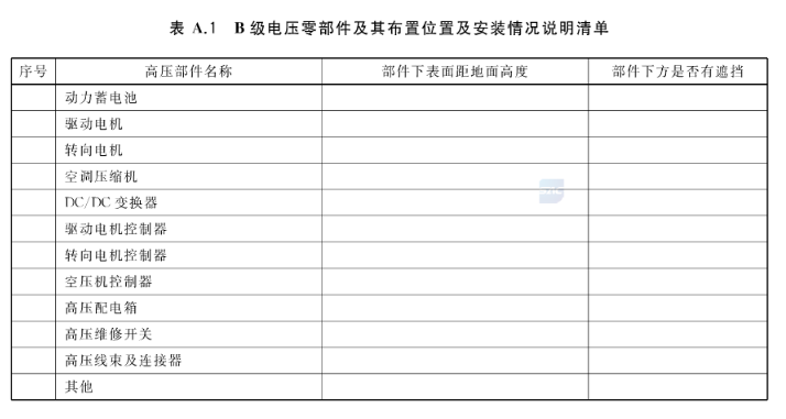 若试验车辆有表A.1中所列的B级电压零部件,则应按照表A.1反馈,若无其中某项或某几项,则这些项目不作要求。此外,B级电压零部件不限于表A.1中列举的清单,依据具体车辆由制造商提供。