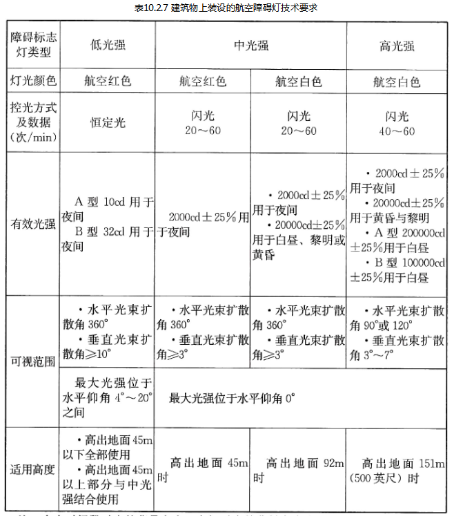 4 航空障碍标志灯技术要求应符合表10.2.7的规定。