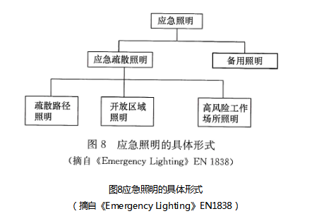 应急照明是现代建筑中的一项重要的安全设施。在建筑发生火灾、电源故障断电或其他灾害时,应急照明对人员疏散、消防和救援工作,保障人身、设备安全,进行必要的操作和处置或继续维持生产、工作都有重要作用。本标准仍延续与《建筑设计防火规范》GB50016-2014(2018年版)、《建筑照明设计标准》GB50034-2013、中国照明学会第1号技术文件《应急照明设计指南》等一致的分类定义,以便于在实行过程中协调一致。但就当前国际上一些技术文件来看,应急照明的分类及其定义已经发生了较大变化。如当前欧盟标准和欧洲各国的相关标准均按照图8进行分类。