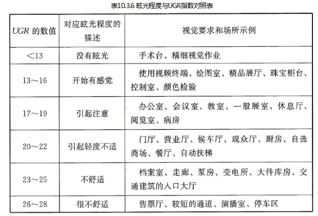 一般照明应根据视觉工作环境特点和眩光程度,合理确定对直接眩光限制的质量等级UGR(统一眩光值)。民用建筑中眩光限制等级宜符合表10.3.6的规定。