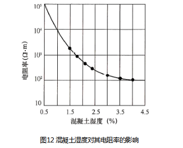 如图12所示,在混凝土的真实湿度的范围内(从水饱和到干涸)其电阻率的变化约为520倍。在重复饱和及干涸的整个过程中,没有观察到各点的位移,也就是每一湿度都有一相应的电阻率。