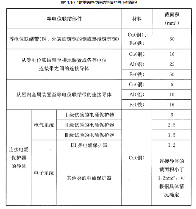 做防雷等电位联结各连接部件的最小截面积,应符合表11.10.2的规定。连接单台或多台Ⅰ级分类试验或D1类电涌保护器的单根导体的最小截面积,还应按下式计算: