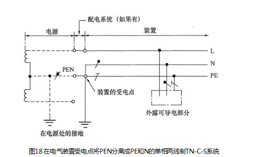 3)TN-C系统,在全系统中,N的功能和PE的功能合并在一根导体中(图19)。电气装置的PEN也可另外增设接地。