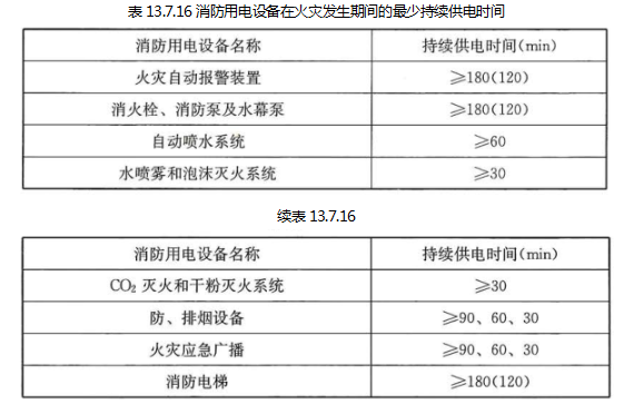各类消防用电设备在火灾发生期间,最少持续供电时间应符合表13.7.16的规定。