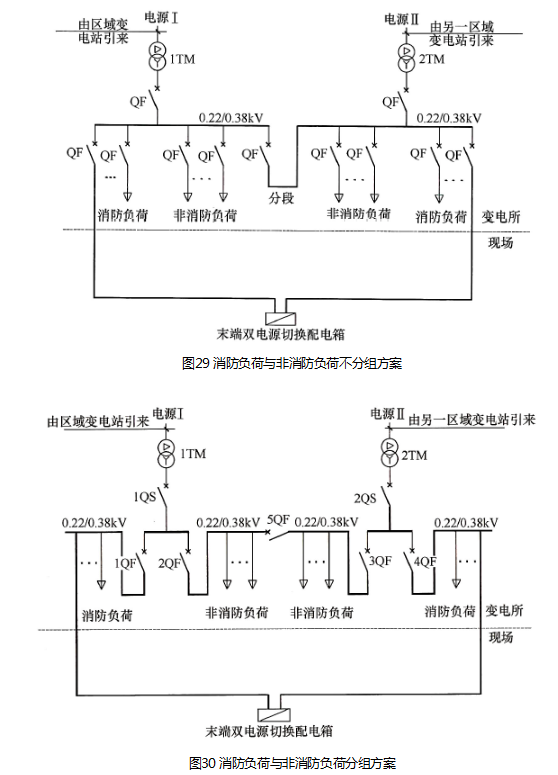 消防负荷的两个配电线路在最末一级配电箱内自动切换,“最末一级配电箱距消防设备多远就算末端了?”这一问题多年来直未能得到很好的解决,本次标准编制,为了解决这一问题,明确规定:消防末端配电箱应设置在消防水泵房、消防电梯机房、消防控制室和各防火分区的配电小间内。各防火分区内的防排烟风机、消防排水泵、防火卷帘等可分别由配电小间内的双电源切换箱放射式、树干式供电。随着电缆技术的发展,为消防设备供电的耐火电缆可靠性不断提高,采用在防火分区内设双电源切换箱供电的方式,也能保证消防设备防排烟风机、消防排水泵、防火卷帘等消防设备的供电可靠性,同时减少双电源切换开关环节,也能规避元件故障风险。