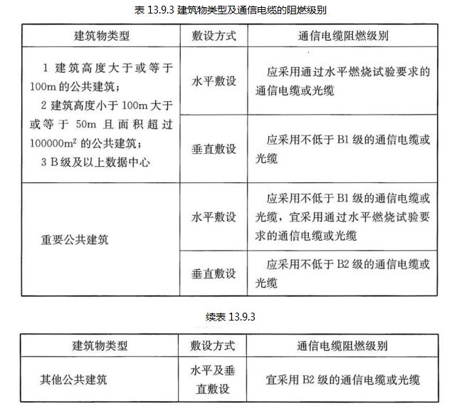 综合布线系统的通信电缆和光缆应根据建筑物的重要性,选择相应燃烧性能等级的通信电缆和光缆,并应符合表13.9.3的规定。