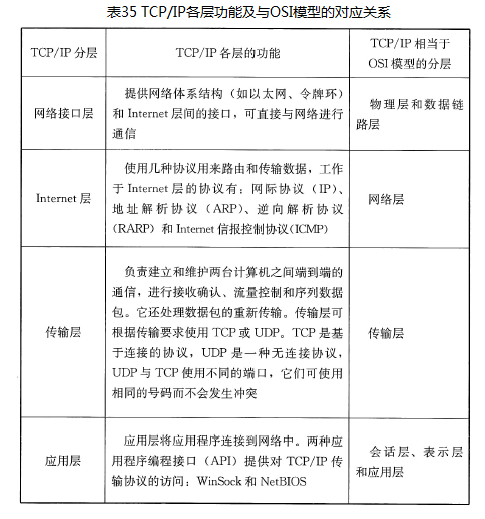 TCP/IP分为四层,各层的功能以及与OSI模型的对应关系参见表35。