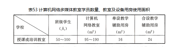 计算机网络多媒体教室宜采用长方形教室竖向布局方式,其各类学校学员与教室使用面积可参见表53的要求。