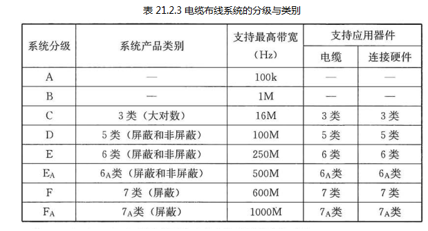 电缆布线系统的分级与类别划分应符合表21.2.3的规定。