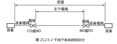 21.2.8 干线子系统应由设备间到电信间的主干线缆、安装在设备间的建筑物配线设备