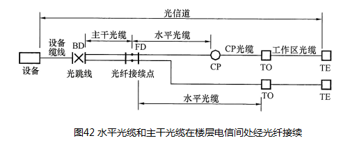 图42表示水平光缆和主干光缆在楼层电信间的光配线设备(FD)经光纤跳线连接互通。