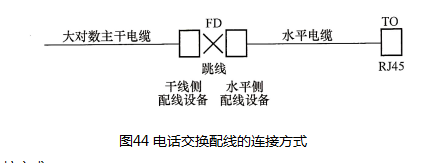 配线子系统中电信间FD与电话交换配线及计算机网络设备之间的连接方式如图44~图46所示。